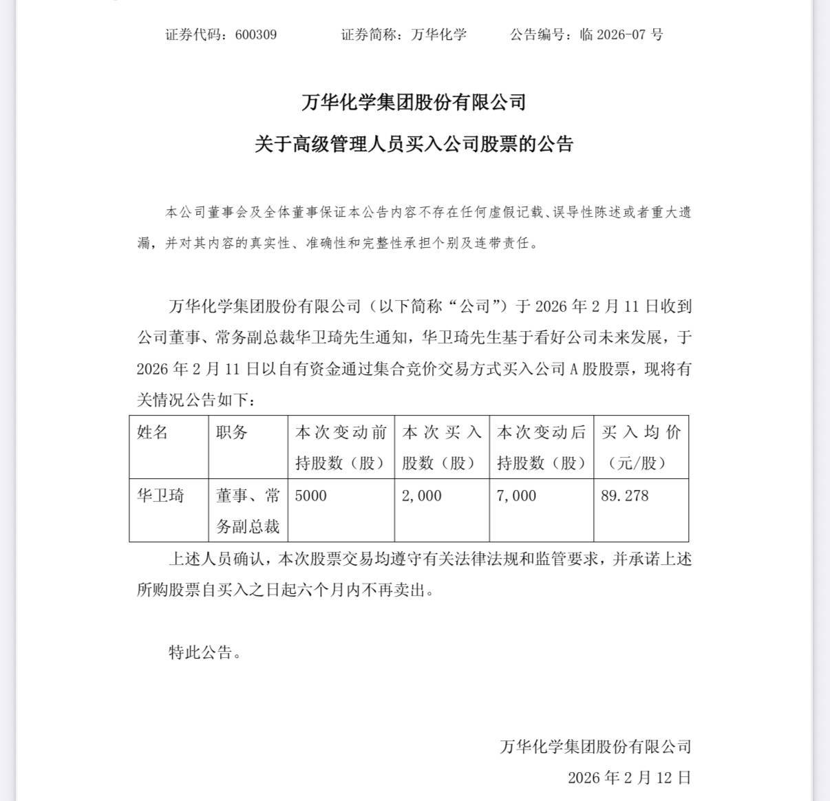 2月11日,万华化学(600309.SH)公告称开yun体育网,公司董事、常务副总裁华卫琦于2026年2月11日以自有资金通过聚首竞价往还款式买入公司A股股票2000股,买入均价为89.278元/股。买入后,华卫琦握股数目从5000股增至7000股。华卫琦应允,所购股票自买入之日起六个月内不再卖出。